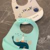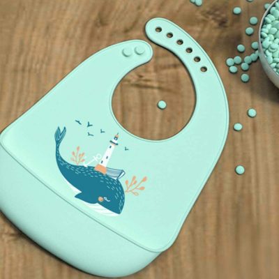 This soft and waterproof bib is made with 100% food-grade silicone. Designed to make mealtimes more hassle-free, it has an adjustable fastening at the back and a deep pocket at the bottom to catch spills. This bib comes in a vibrant aqua blue color with a cute green whale design on it.